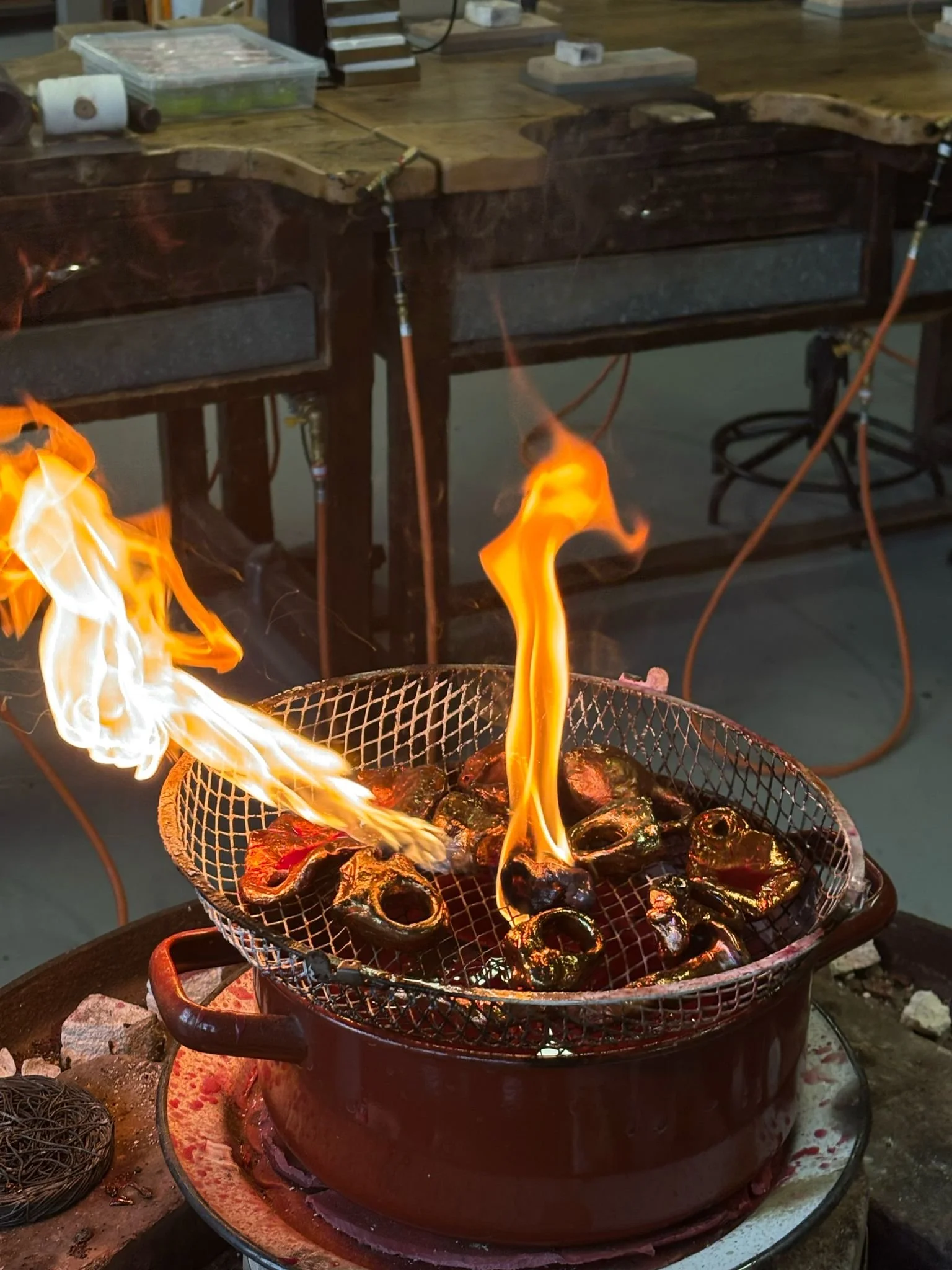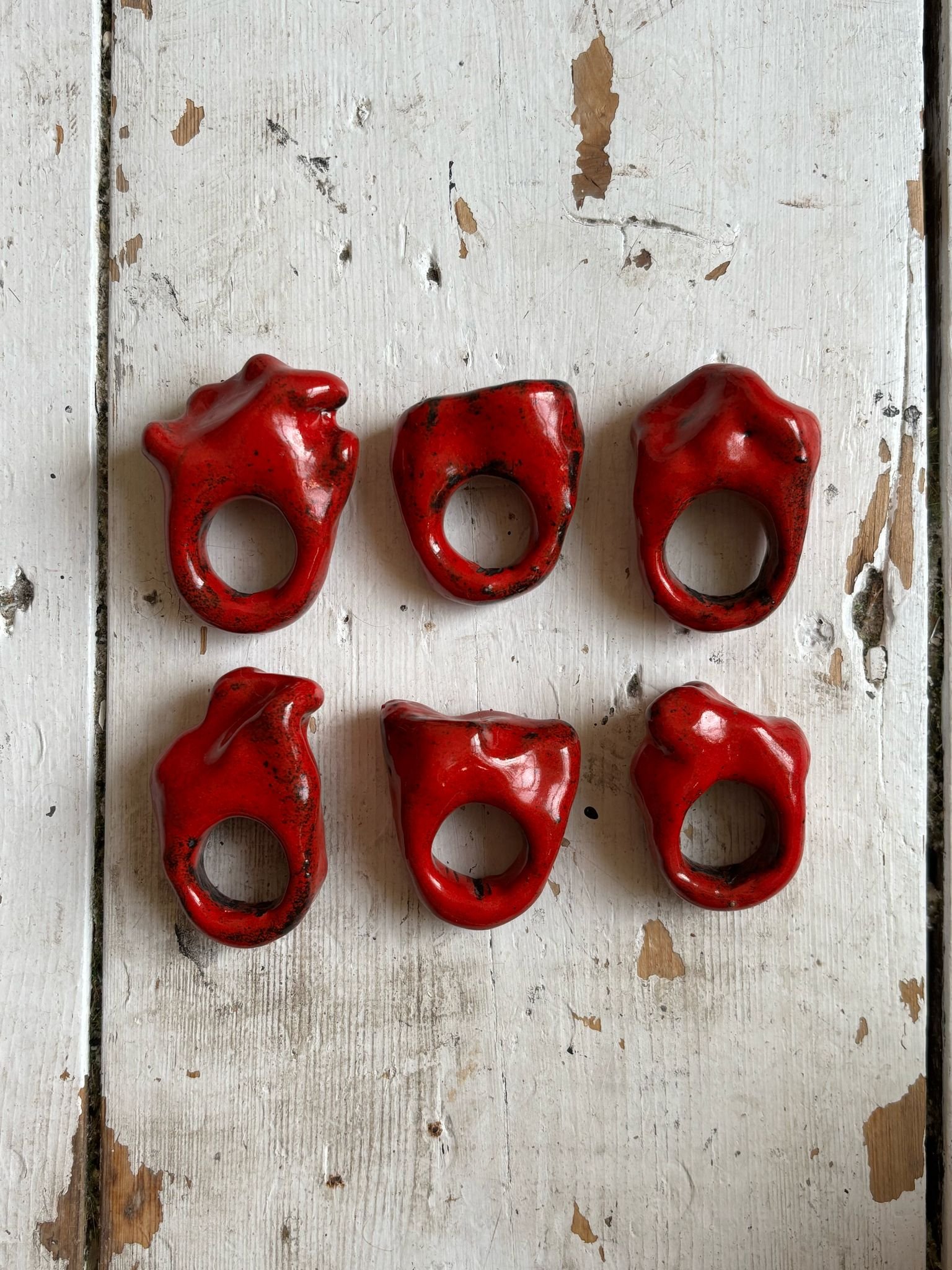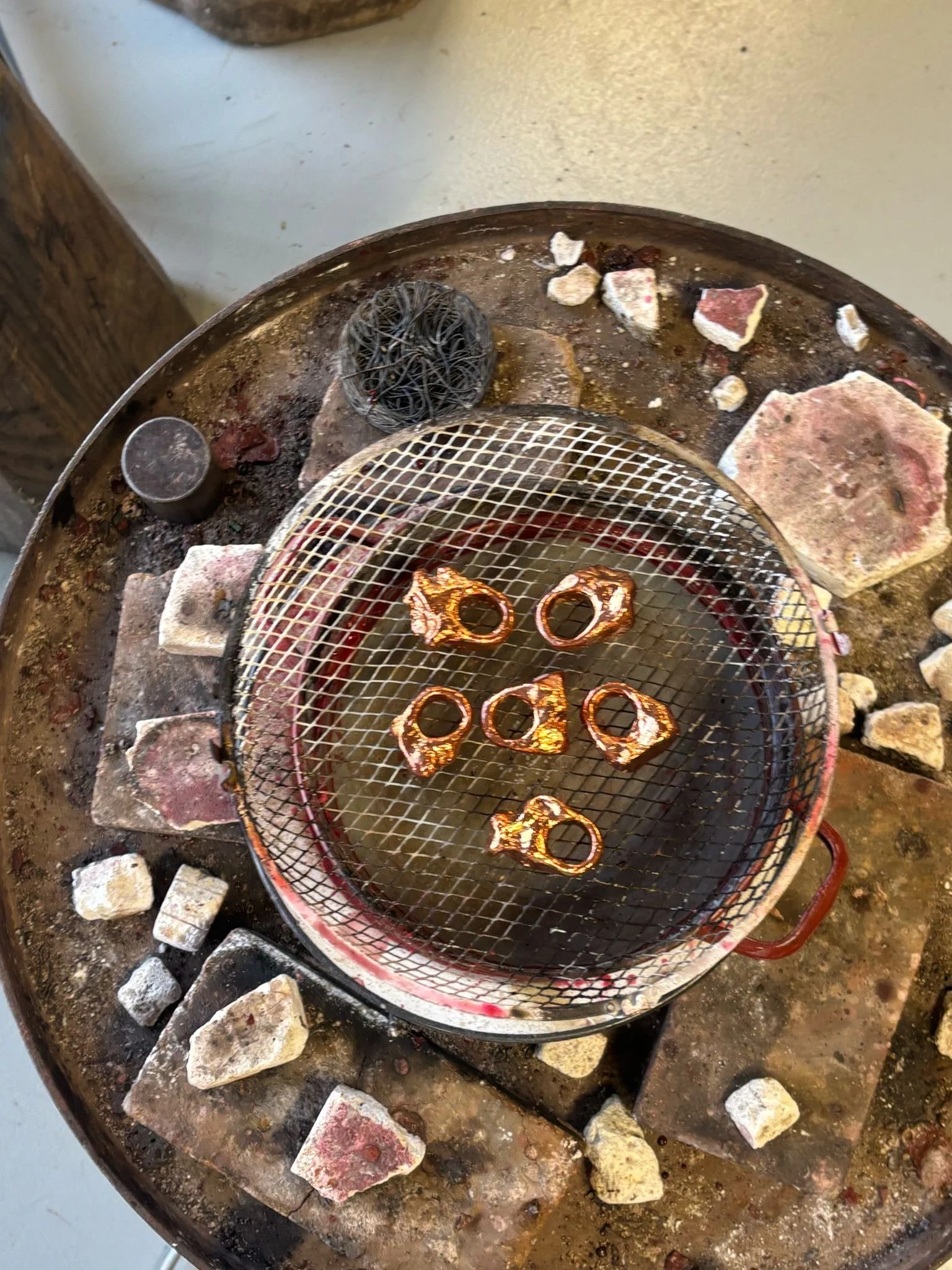Seis anillos de cera, posteriormente electrofrmados y esmaltados a mano.